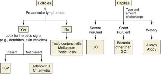 Other. Conjunctival papillae, marked chemosis, preauricular adenopathy, and eyelid swelling. See 8.9, Ophthalmia Neonatorum (Newborn Conjunctivitis), for a detailed discussion of gonococcal conjunctivitis in the newborn.