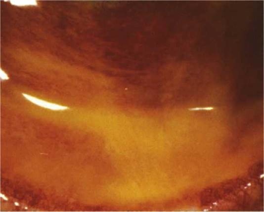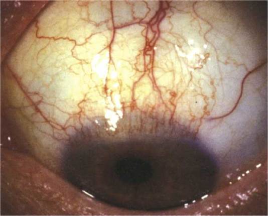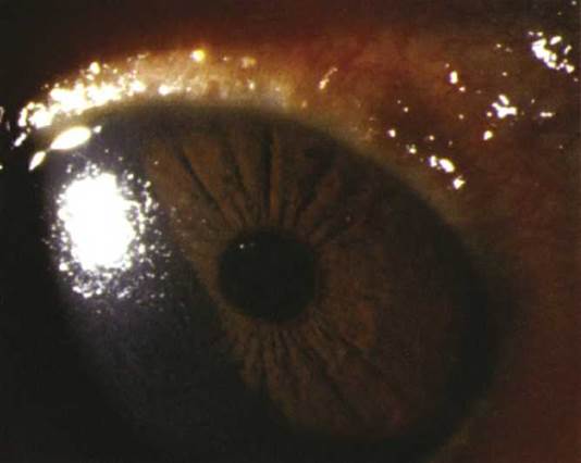 1. Examine the entire cornea for peripheral ulcers (especially superiorly) because of the risk for rapid progression to perforation (see Figure 5.1.8).