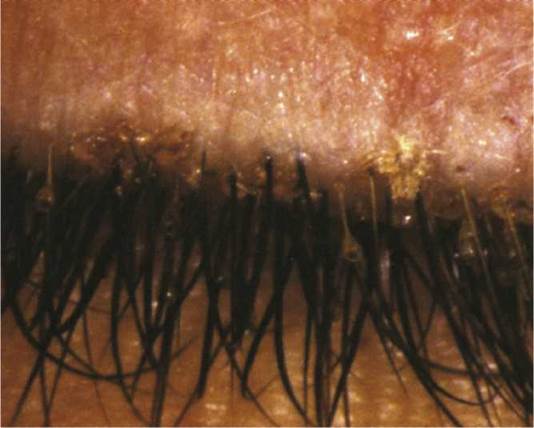 Critical. Adult lice, nits, and blood-tinged debris on the eyelids and eyelashes (see Figure 5.1.9).