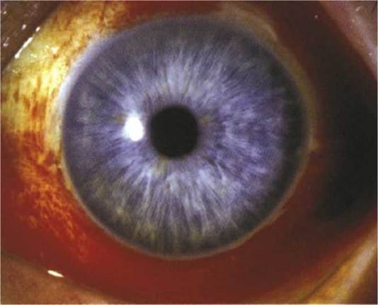 • Hemosiderosis: A dark iris can result after iron breakdown products from old blood deposits on the iris surface. Patients have a history of a traumatic hyphema or vitreous hemorrhage.