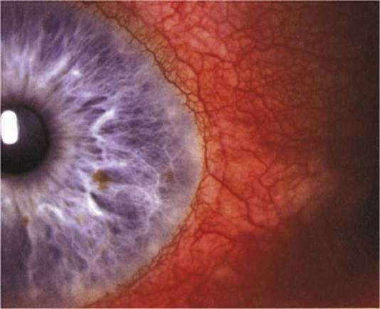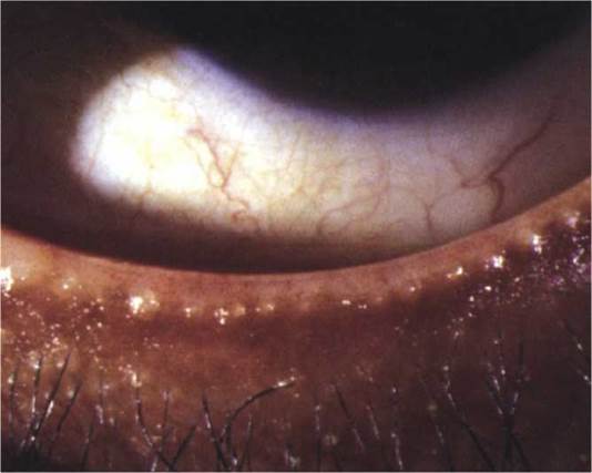 FIGURE 5.1.7 Vernal/atopic conjunctivitis with raised white dots of eosinophils along limbus.