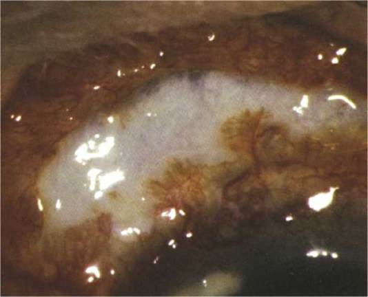 Typically occurs in middle-aged to elderly people. Leukoplakic or gray-white, gelatinous lesion that usually begins at the limbus. Occasionally, a papillomatous, fern-like vascular appearance develops. Usually unilateral and unifocal. Can evolve into invasive squamous cell carcinoma (see Figure 5.12.1) if not treated early and successfully. Can spread over the cornea or, less commonly, invade the eye or metastasize. The preferred treatment is a complete excisional biopsy followed by supplemental cryotherapy to the remaining adjacent conjunctiva. Excision may require lamellar dissection into the corneal stroma and sclera in recurrent or longstanding lesions. Topical forms of mitomycin C, 5-fluorouracil, and interferon have also been used. Periodic follow-up examinations are required to detect recurrences.