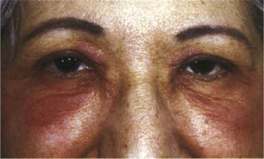 Chemosis, red and edematous eyelids, conjunctival papillae, periocular hyperpigmentation, and no preauricular node (see Figure 5.1.5).