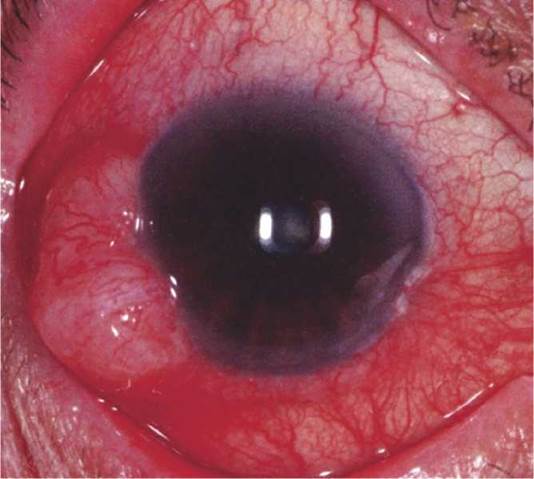 2. Argyrosis: Silver deposition causes black discoloration. Patients may have a history of long-term use of silver nitrate drops.