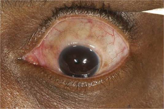 1. Ochronosis with alkaptonuria: Autosomal recessive enzyme deficiency. Occurs in young adults with arthritis and dark urine. The pigment is at the level of the sclera, which can cause a “pigmented pinguecula.” Blue-black discoloration of the ear cartilage.
