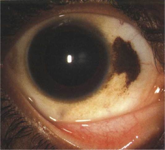 A congenital episcleral (not conjunctival) lesion, as demonstrated (after topical anesthesia) by moving the conjunctiva back and forth over the area of pigmentation with a cotton-tipped swab (conjunctival pigmentation will move with the conjunctiva). Typically, the lesion is unilateral, blue-gray, and often accompanied by a darker ipsilateral iris and choroid. In oculodermal melanocytosis, also called nevus of Ota, the periocular skin is also pigmented. These lesions are slightly pigmented at birth but can become more pigmented at puberty. Both conditions predispose to melanoma of the uveal tract, orbit, and brain (most commonly in whites) and glaucoma. It is estimated that 1/400 affected patients develop uveal melanoma.