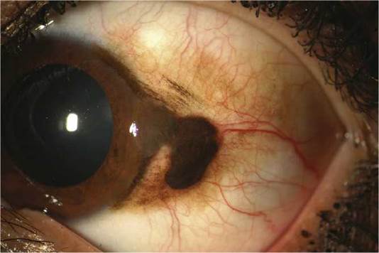 Flat, brown patches of pigmentation, without cysts, in the conjunctiva. Usually arise during or after middle age and almost always occur in whites. Classically, approximately 10% to 30% of these lesions develop into melanoma. Malignant transformation should be suspected when an elevation or increase in vascularity in one of these areas develops. Management options depend on the lesion size. If 1 to 2 clock hour size, then careful observation with photographic comparison is advised. If 2 to 4 clock hour size, then excisional biopsy followed by cryotherapy is advised. If >4 clock hour size, then incisional biopsy plus cryotherapy is performed.