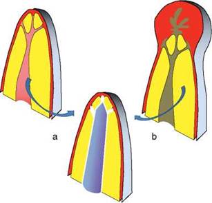 Figure 1.1 Pulp extirpation (a) prevents and root canal disinfection (b) cures apical periodontitis. Both need a root filling of the entire pulpal space.