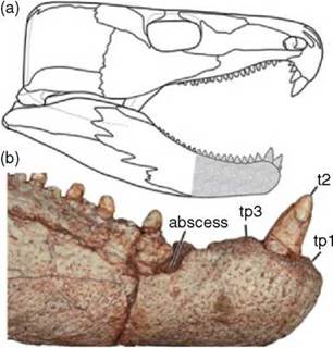Figure 1.2 Evidence of dental and mandibular pathology in Labidosaurus hamatus, a basal reptile from the Lower Permian of Oklahoma. (a) Skull reconstruction in right lateral view. (b) right hemi-mandible in lateral view. Reproduced with permission from [40].