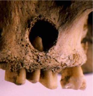 Figure 1.3 Apical periodontitis in an upper premolar of a woman's skull found in Iceland and dating to the 12th century. Trauma or wear caused exposure of the pulp with infection and lesion development.