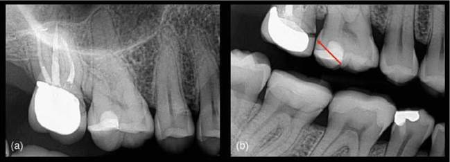 Figure 6.1 Geometric distortion. (a) Periapical radiograph of a root treated upper right molar tooth does not reveal anything untoward, (b) however, the change in the bitewing radiograph reveals a deficient crown margin (red arrow).