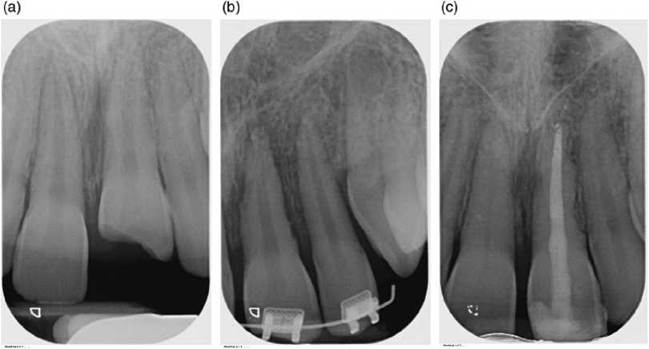 Figure 6.3 Dental trauma with external inflammatory resorption. (a) Periapical radiograph of maxillary central incisor teeth following a traumatic dental injury in which tooth 21 was severely intruded. (b) Within one week tooth 21 had undergone external inflammatory resorption with the development of excavations on the root surface of the tooth and associated radiolucencies in the adjacent bone. The entire root length, including the apical third, was involved. (c) Periapical radiograph of tooth 22 one year after the injury demonstrates resolution of the apical periodontitis and cessation of the resorptive process, although the shape of the root surface has been permanently altered.