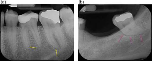 Figure 6.7 Periodontal ligament space. (a) Periapical radiograph of tooth 36 and 37, demonstrating widening of the PDL space on the mesial roots each tooth (yellow arrows). Both had symptoms of irreversible pulpitis. (b) Periapical radiograph of tooth 37, which is a lone standing tooth and the terminal tooth in the arch. Widening of the PDL space on the mesial aspect of the tooth (pink arrows) is related to traumatic occlusion.