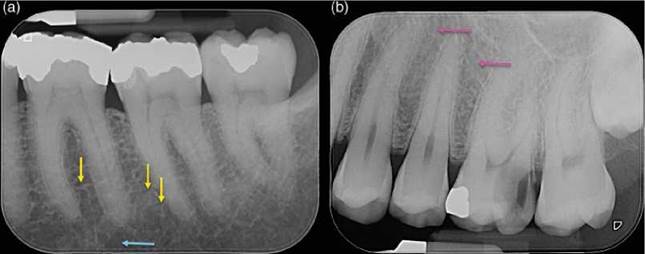 Figure 6.8 Periodontal ligament space. (a) Periapical radiograph of the mandibular right first, second and third molars. The predominantly horizontally oriented boney trabeculae (yellow arrows). Wider marrow spaces (blue arrow) may be mistaken for periapical radiolucencies. (b) The trabeculae in the maxilla (pink arrows) are thinner and more compact compared to those in the mandible.