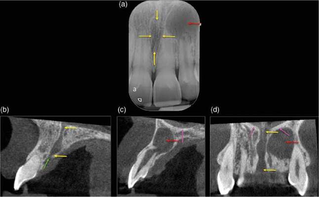 Figure 6.9 Incisive foramen. (a) Periapical radiograph of teeth 11, 21 and 22. The incisive foramen/canal (yellow arrows) is represented on the radiograph as an elongated radiolucency between teeth 11 and 21. There is a large periapical radiolucency associated with tooth 22 (red arrow). (b) Sagittal CBCT view demonstrating the incisive canal (between yellow arrows) and the incisive foramen (green arrow). (c) Sagittal CBCT view demonstrating the periapical radiolucency associated with tooth 22 (red arrow) and its relationship with the nasal cavity (pink arrow). (d) Coronal CBCT view demonstrating the relationship of the incisive canal (between yellow arrows) to the nasal cavity (pink arrows) and the periapical radiolucency associated with tooth 22 (red arrow).