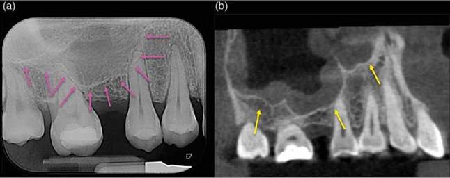 Figure 6.10 Maxillary sinus. (a) Periapical radiograph of the maxillary right posterior teeth demonstrating the inferior border of the right maxillary sinus represented by a thin, poorly defined radiopaque line (pink arrows). (b) Sagittal CBCT view accurately demonstrating the true dimensions of the maxillary air sinus and its multiple lobes (yellow arrows).