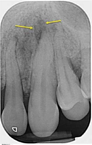 Figure 6.13 Incipient periapical bone loss. Periapical radiograph of the non-vital tooth 23. Demineralization of the bone around the apex of tooth 23 resulting in a "shotgun" appearance of the bone in the area (yellow arrows).