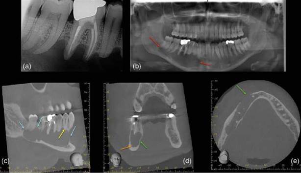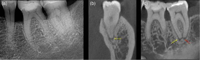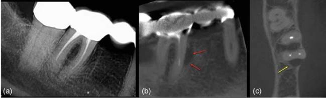 Figure 6.16 Apical periodontitis. (a) Radiograph of lower left quadrant in patient with poorly localized symptoms of irreversible pulpitis. (b, c) coronal and sagittal reconstructed CBCT views confirm a periapical radiolucency associated with the mesial (yellow arrow) and distal (red arrow) roots of the lower left second molar tooth.