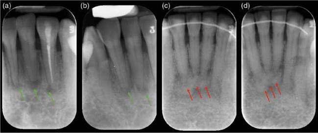 Very little is known about how the healing process of AP manifests radiographically; the healing timescale is highly variable. There is some evidence that a transient increase in bone density may occur over the first few weeks of healing [84, 85]. However, as outlined previously, radiolucencies associated with AP may partially resolve but ultimately persist for decades after treatment, before completely healing [76, 77, 110]. During healing the radiographic density of the periapical lesion increases as new bone is laid down within it. It is unknown if the bone is deposited concentrically from the lesion margins or if spiculae projecting towards the center of the lesion multiply to fill. If the cortical plate has been perforated, healing commences by the re-establishment of the integrity of the cortical plate and bone depo- sition then proceeds from there towards the center of the lesion [17]. The newly formed bone lacks maturity and may appear less organized than adjacent healthy bone. Eventually, in healed cases the periodontal ligament space and lamina dura will re- establish. Persistent widening of the periodontal ligament space and persistent bony rarefaction associated with excess filling material are radiographic characteristics of the healing process of root-filled teeth. Complete healing may develop with time [76, 110].