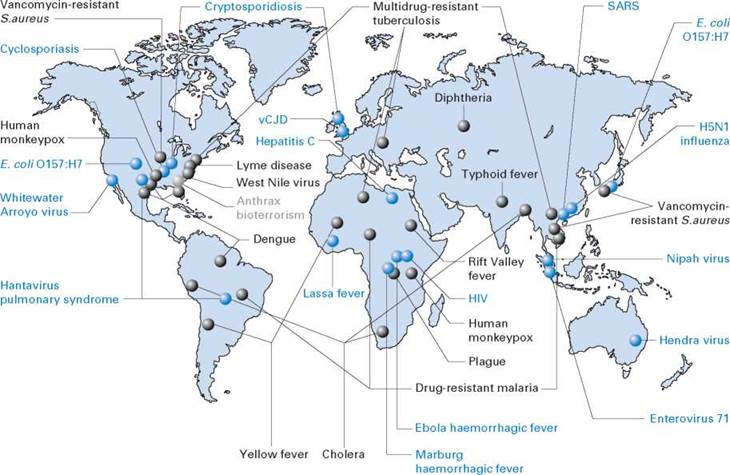 Fig. 1.1 Global prevalence of some emerging and re-emerging diseases. E. coli, Escherichia coli; HIV, human immunodeficiency virus; SARS, severe acute respiratory syndrome; S. aureus, Staphylococcus aureus; vCJD, variant Creutzfeldt—Jakob disease.