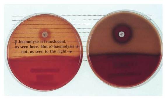 Fig. 11.1 a- and β-haemolysis: p-haemolytic colonies (e.g., Streptococcus pyogenes) produce complete translucence of blood agar, whereas a-haemolytic colonies (e.g., Streptococcus pneumoniae) do not. Note also the sensitivity of Streptococcus pneumoniae to a disc impregnated with optochin.