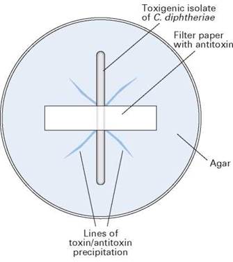 The exotoxin responsible for virulence can be demonstrated by the gel precipitation test, which uses the Elek plate. In this test, a filter paper soaked in diphtheria antitoxin is incorporated into serum agar before it has set; the test strain of C. diphtheriae under investigation is then streaked on to the agar at right angles to the filter-paper strip and incubated at 37°C. After 24 h, white lines of precipitation will be visible as a result of the combination of the antitoxin and the antigen (i.e., the toxin) if the strain is a toxigenic isolate (Fig. 12.1). Although this is the traditional method for toxin detection, enzyme-linked immunosorbent assays (ELISAs) and immunochromatographic strips are now available for quick detection of the exotoxin from the cultured isolates.