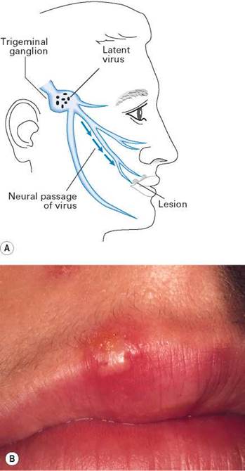 Fig. 21.3 Herpes labialis: (A) recurrence of facial herpes infection due to reactivation of the latent virus in the trigeminal ganglion; (B) clinical presentation of herpes labialis on the mucocutaneous junction of the upper lip.