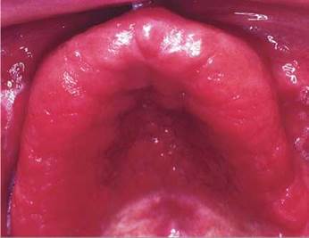 Fig. 35.3 Erythematous candidiasis of the palate in a human immunodeficiency virus (HIV)-infected individual.