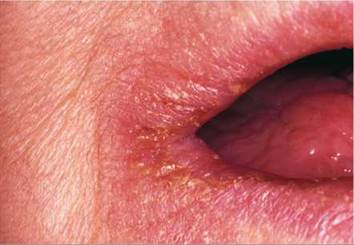 Fig. 35.8 Angular cheilitis in a denture-wearer. Note the yellow crusting due to staphylococcal infection.