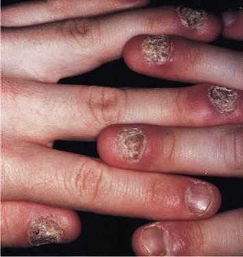 Fig. 35.11 Candidal paronychia in a patient with chronic mucocutaneous candidiasis. (Note: this patient also had scalp and oral involvement.)