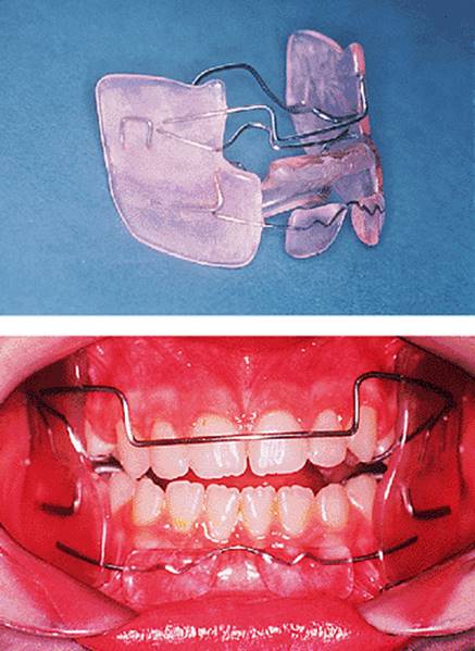 This appliance's main difficulty is management of deep overbite, because of the buccal blocks. As the overjet reduces, lateral open bites develop which are then closed by progressively trimming the blocks in such a way as to allow the posterior teeth to erupt but at the same time maintain the forward posturing.