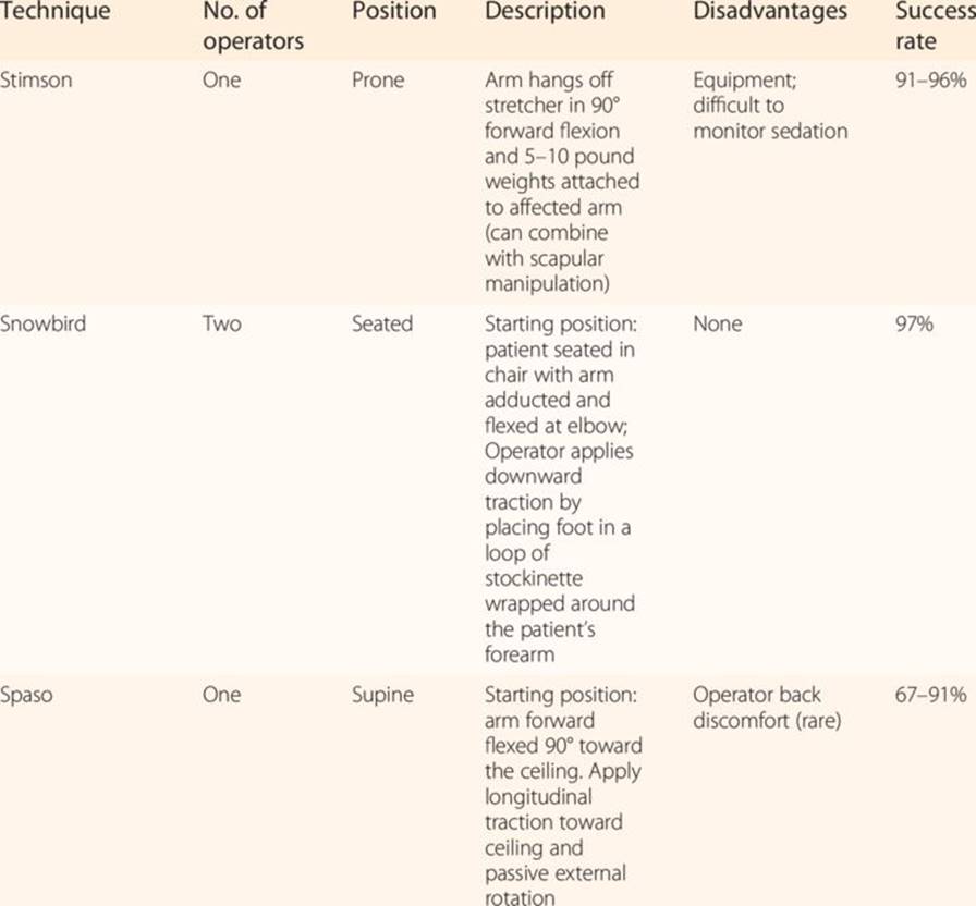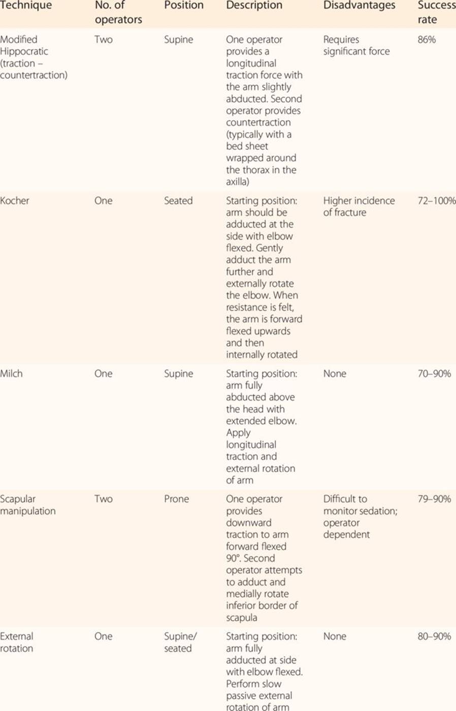 Data from Ufberg JW, Vilke GM, Chan TC, et al. Anterior shoulder dislocations: beyond traction-countertraction, J Emerg Med. 2004; 27(3):3001–6. Reproduced with permission from Malik, et al. 2010.
