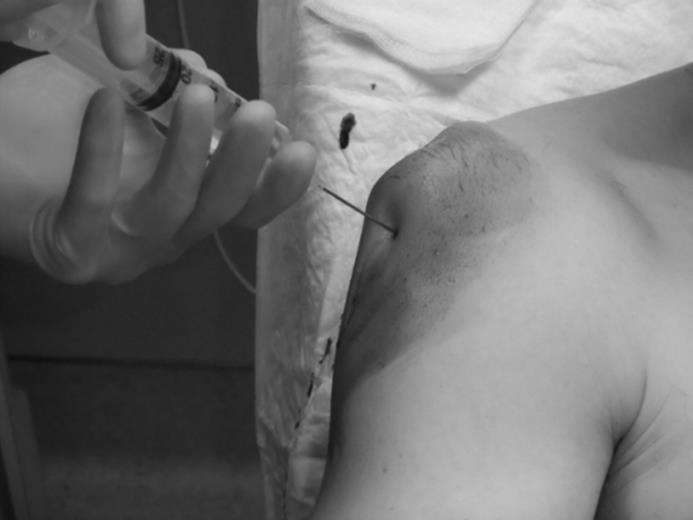 § Holding negative pressure, insert the 20 cc syringe with attached spinal needle into the lateral aspect of the shoulder perpendicular to the skin
