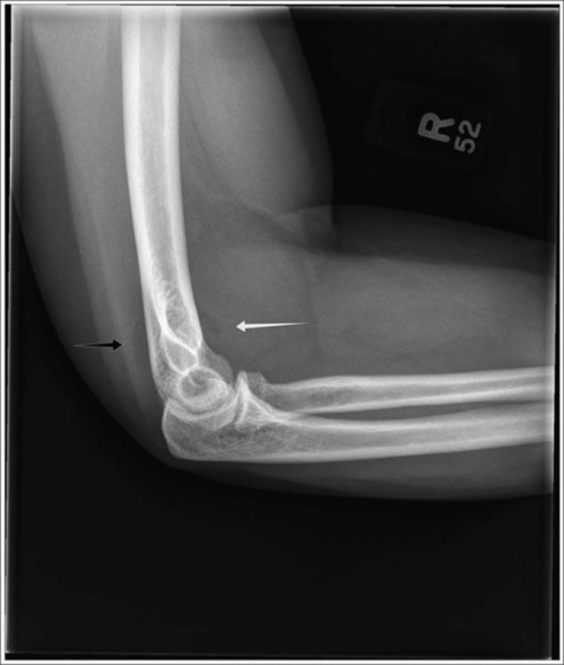 Figure 2.11 Mason Type I fracture of the radial head. Note the presence of a posterior fat pad and a displaced anterior fat pad suggestive of an effusion and occult fracture. Upon close inspection, a radial head fracture is noted. (Reproduced with permission of the Department of Emergency Medicine, Feinberg School of Medicine, Northwestern University.)