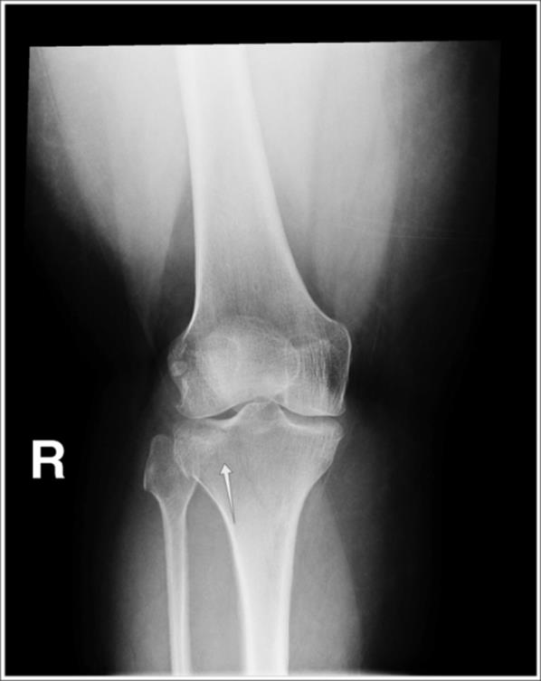Figure 4.1 “Sunrise” or “skyline” view: Additional view that can increase sensitivity of the radiograph for patellar fractures. Here a fracture is noted. (Image courtesy of Arun Sayal, MD.)