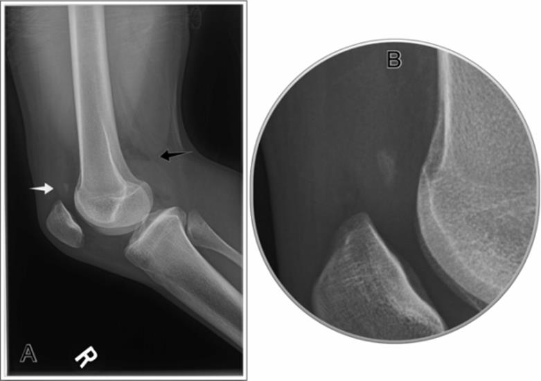 Figure 4.17 A: Patellar dislocation post-reduction shows an osteochondral fragment (white arrow) seen just above and posterior to the patella. Enlarged in B. Also seen is a lipohemarthrosis (black arrow) behind the femur, indicating the presence of a fracture. (Image courtesy of Arun Sayal, MD.)