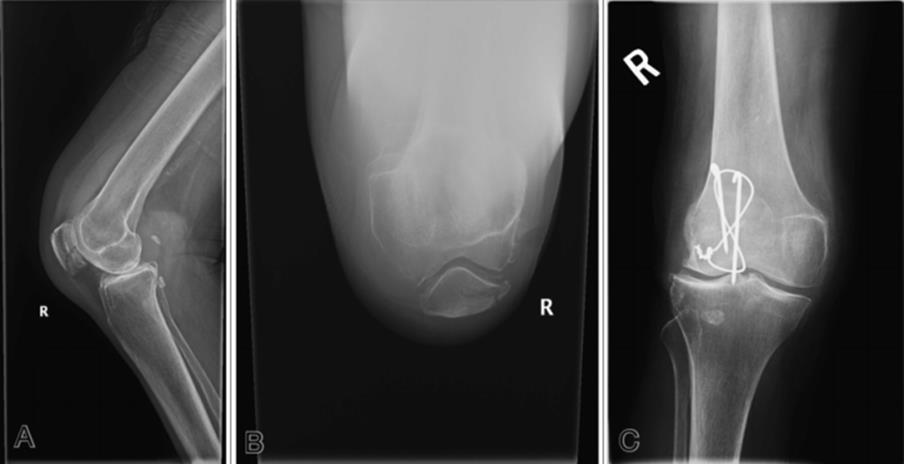 Figure 4.20 A: A comminuted fracture of the patella. B: A “sunrise” or “skyline” view of the same fracture – shows comminution. C: The patient did not have an intact extensor mechanism, so was treated operatively with internal fixation by tension band wiring. (Images courtesy of Arun Sayal, MD.)
