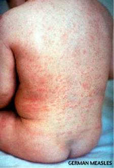 Infection occurs most commonly in children, and produces a fine rash over the body that lasts only two or three days, is not itchy, and is not accompanied by the sore eyes and cold symptoms associated with common measles. There are often some enlarged lymph nodes at the back of the neck, and in severe cases there may be a fever, runny nose and joint pains.