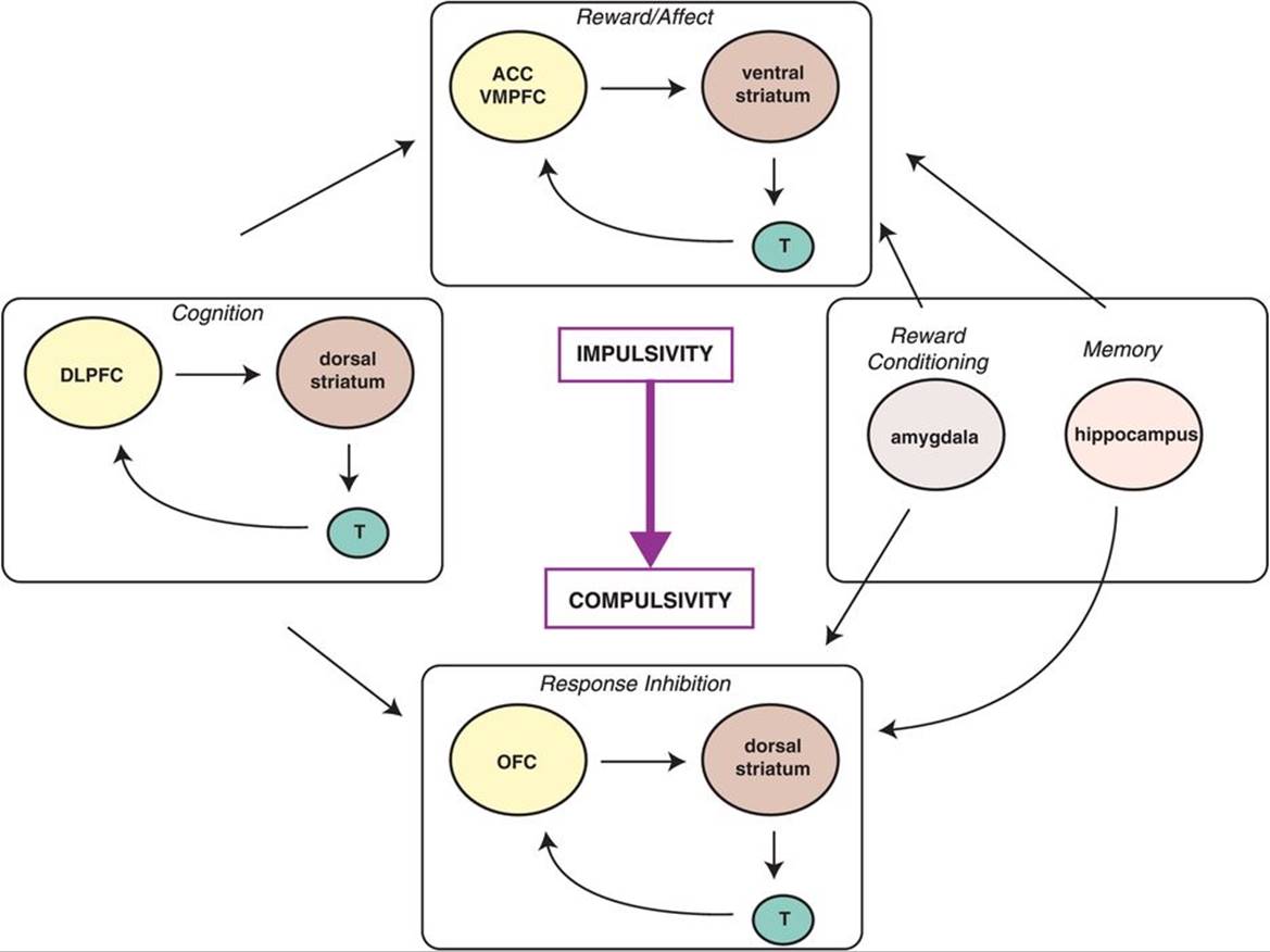 The current conceptualization of impulsivity and compulsivity as dimensions of psychopathology that cut across many psychiatric disorders suggests that behaviors themselves may be reinforcing and addicting. Rewarding behaviors and addictions to certain behaviors hypothetically share the same underlying circuitry as drug addiction (Figures 14-1 through 14-7). Impulsivity/compulsivity cannot explain all the aspects of these various and sundry conditions, and discussing how this construct could apply to each of them risks oversimplying some very complex and very different disorders (Table 14-1; Tables 14-4 through 14-8). Furthermore, the discussion in this chapter does not address the many other unique aspects of these disorders, their current diagnostic criteria, the ongoing debates on their evolving diagnostic criteria, or even whether some conditions are disorders at all. Instead we look here at psychiatric conditions which exhibit behaviors that are either impulsive (meaning that they are difficult to prevent because short-term reward is chosen over long-term gain) or compulsive (meaning that an originally rewarding behavior becomes a habit which is difficult to stop because it reduces tension and withdrawal effects).