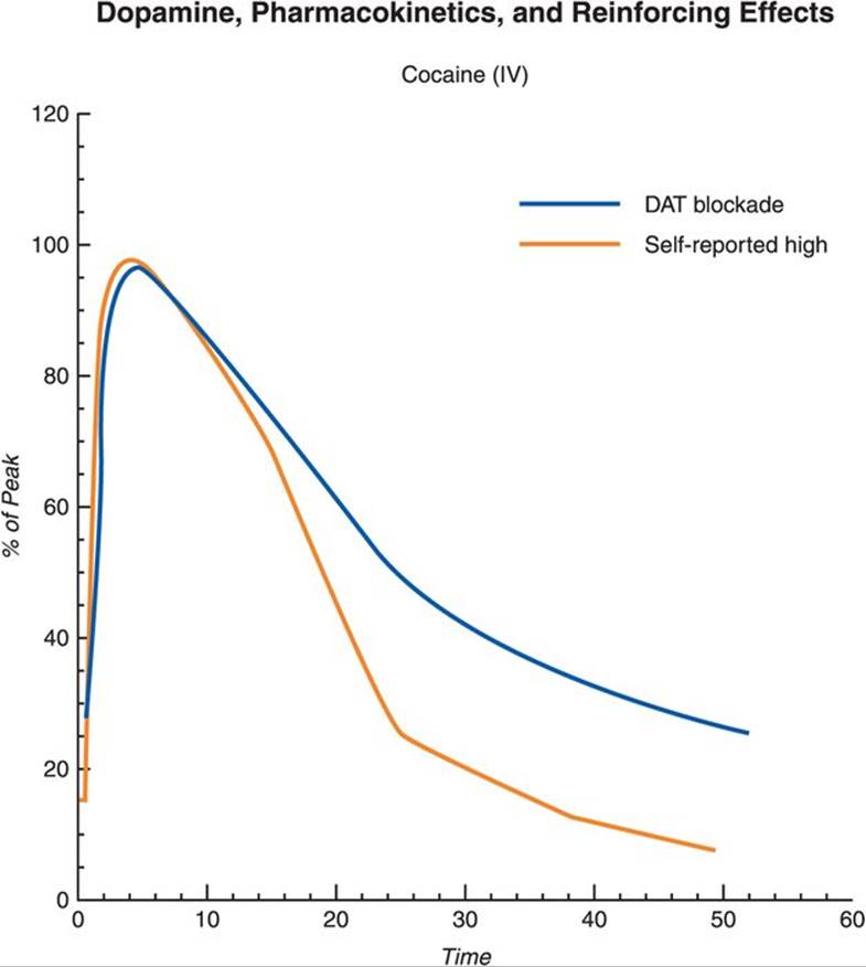 Figure 14-8. Dopamine, pharmacokinetics, and reinforcing effects. Acute drug use causes dopamine (DA) release in the striatum. However, the reinforcing effects of the drug are largely determined not only by the presence of DA but also by the rate at which DA increases in the brain, which in turn is dictated by the speed at which the drug enters and leaves the brain, in this case targeting the dopamine transporter (DAT). An abrupt and large increase in DA (such as that caused by drugs of abuse that block DAT) mimic the phasic DA firing associated with conveying information about reward and saliency. The rate of drug uptake is subject to the route of administration, with intravenous administration and inhalation producing the fastest drug uptake, followed by snorting. In addition, different drugs of abuse have different “reward values” (i.e., different rates at which they increase DA) based on their individual mechanisms of action.