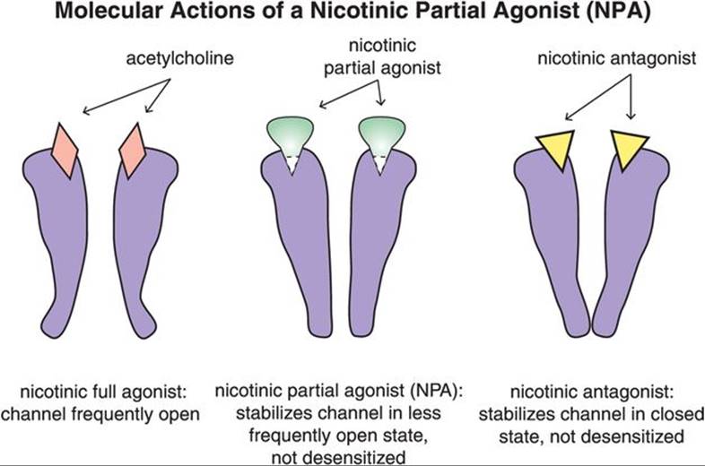 The α4β2-nicotinic receptors adapt to the chronic intermittent pulsatile delivery of nicotine in a way that leads to addiction (Figure 14-10). That is, initially these receptors in the resting state are opened by delivery of nicotine, which in turns leads to dopamine release and reinforcement, pleasure, and reward (Figure 14-10A). By the time the cigarette is finished, these receptors become desensitized, so that they cannot function temporarily and thus cannot react either to acetylcholine or to nicotine (Figure 14-10A). In terms of obtaining any further reward, you might as well stop smoking at this point. An interesting question to ask is: how long does it take for the nicotinic receptors to desensitize? The answer seems to be: about as long as it takes to inhale all the puffs of a standard cigarette and burn it down to a butt. Thus, it is probably not an accident that cigarettes are the length that they are. Shorter does not maximize the pleasure. Longer is a waste since by then the receptors are all desensitized anyway (Figure 14-10A).