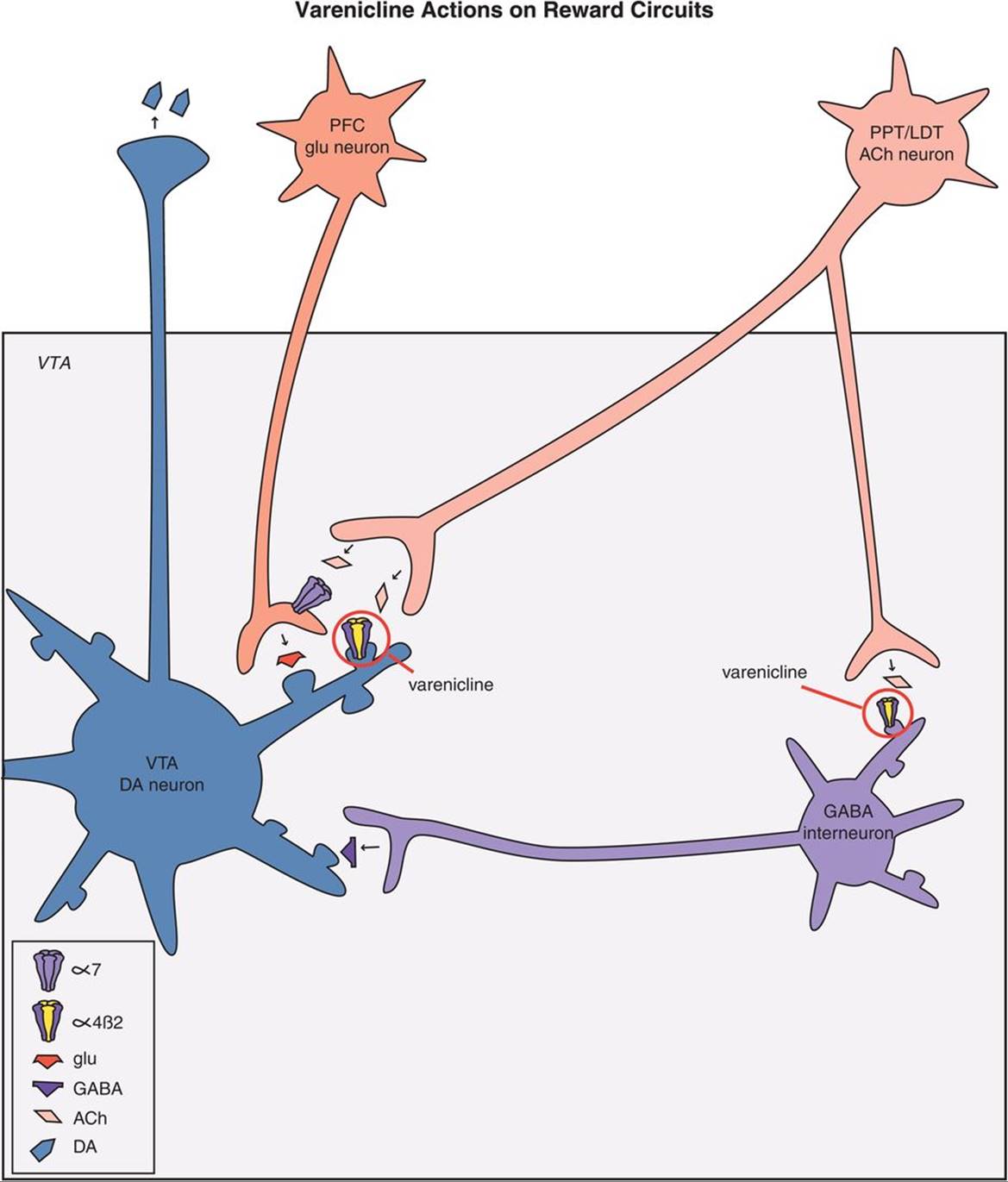 Nicotine acts directly upon nicotinic cholinergic receptors in reward circuits (Figure 14-7). Cholinergic neurons and the neurotransmitter acetylcholine are discussed in Chapter 13 and illustrated in Figures 13-17 through 13-24. Nicotinic receptors are illustrated in Figures 13-20 through 13-22. There are two major subtypes of nicotinic receptors that are known to be present in the brain, the α4β2 subtype and the α7subtype (discussed in Chapter 13 and illustrated in Figure 13-20). Nicotine’s actions in the ventral tegmental area are those that are theoretically linked to addiction, namely at α4β2-nicotinic postsynaptic receptors on dopamine neurons, leading to dopamine release in the nucleus accumbens, and at α7-nicotinic presynaptic receptors on glutamate neurons, which causes glutamate release, and in turn dopamine release in the nucleus accumbens (Figure 14-9). The release-promoting actions of presynaptic α7-nicotinic receptors on glutamate neurons are discussed in Chapter 13 and illustrated in Figure 13-20. Nicotine also appears to desensitize α4β2 postsynaptic receptors on inhibitory GABAergic interneurons in the VTA (Figure 14-9); this also leads to DA release in nucleus accumbens by disinhibiting dopaminergic mesolimbic neurons. Actions of nicotine on postsynaptic α7-nicotinic receptors in the prefrontal cortex may be linked to the pro-cognitive and mentally alerting actions of nicotine, but not to addictive actions.