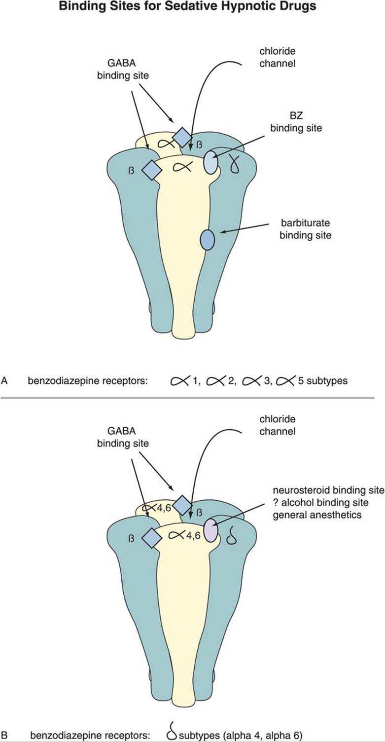 Sedative hypnotics include barbiturates and related agents such as ethclorvynol and ethinamate, chloral hydrate and derivatives, and piperidinedione derivatives such as glutethimide and methyprylon. Experts often include alcohol, benzodiazepines (discussed in Chapter 9), and Z-drug hypnotics (discussed in Chapter 11) in this class as well. The mechanism of action of sedative hypnotics is basically the same as those described in Chapter 9 and illustrated in Figure 9-23 for the action of benzodiazepines: namely, they are positive allosteric modulators (PAMs) for GABAA receptors. Actions of sedative hypnotics are at GABAA receptor sites in reward circuits (Figure 14-7). Molecular actions of all sedative hypnotics are similar, but benzodiazepines and barbiturates seem to work at different sites from each other, and also only on some GABAA receptor subtypes, namely those with α1, α2, α3, or α5 subunits (Figure 14-14). Barbiturates are much less safe in overdose than benzodiazepines, cause dependence more frequently, are abused more frequently, and produce much more dangerous withdrawal reactions. Apparently, the receptor site at GABAA receptors mediating the pharmacologic actions of barbiturates is even more readily desensitized with even more dangerous consequences than the benzodiazepine receptor (Figure 14-14). The barbiturate site must also mediate a more intense euphoria and a more desirable sense of tranquility than the benzodiazepine receptor site. Since benzodiazepines are generally an adequate alternative to barbiturates, psychopharmacologists can help to minimize abuse of barbiturates by prescribing them rarely if ever. In the case of withdrawal reactions, reinstituting and then tapering the offending barbiturate under close clinical supervision can assist the detoxification process.