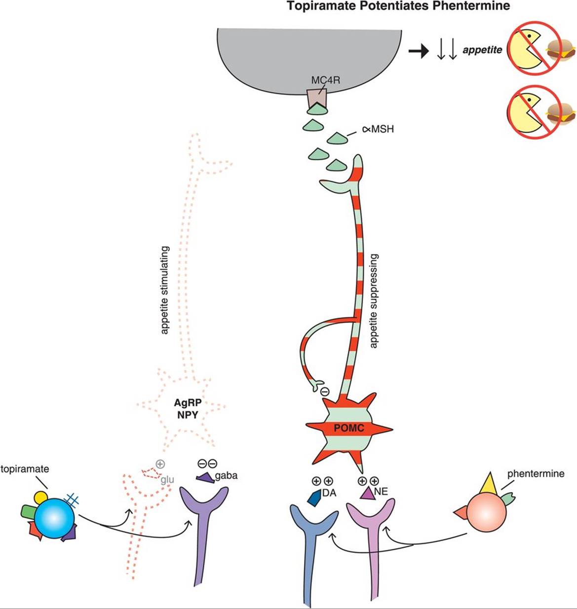C. Topiramate potentiates the actions of phentermine. Topiramate hypothetically inhibits the appetite-stimulating pathway on the left by reducing excitatory glutamatergic input and by increasing inhibitory GABA-ergic input (shown as faded neurons on the left). Combining this with phentermine’s actions on the right that stimulate the appetite-suppressing pathway (shown as a hatched color and also shown in Figure 14-20B), this results in a synergistic and enhanced effect on appetite and on weight loss, allowing lower, more tolerable doses of both phentermine and topiramate to be used.