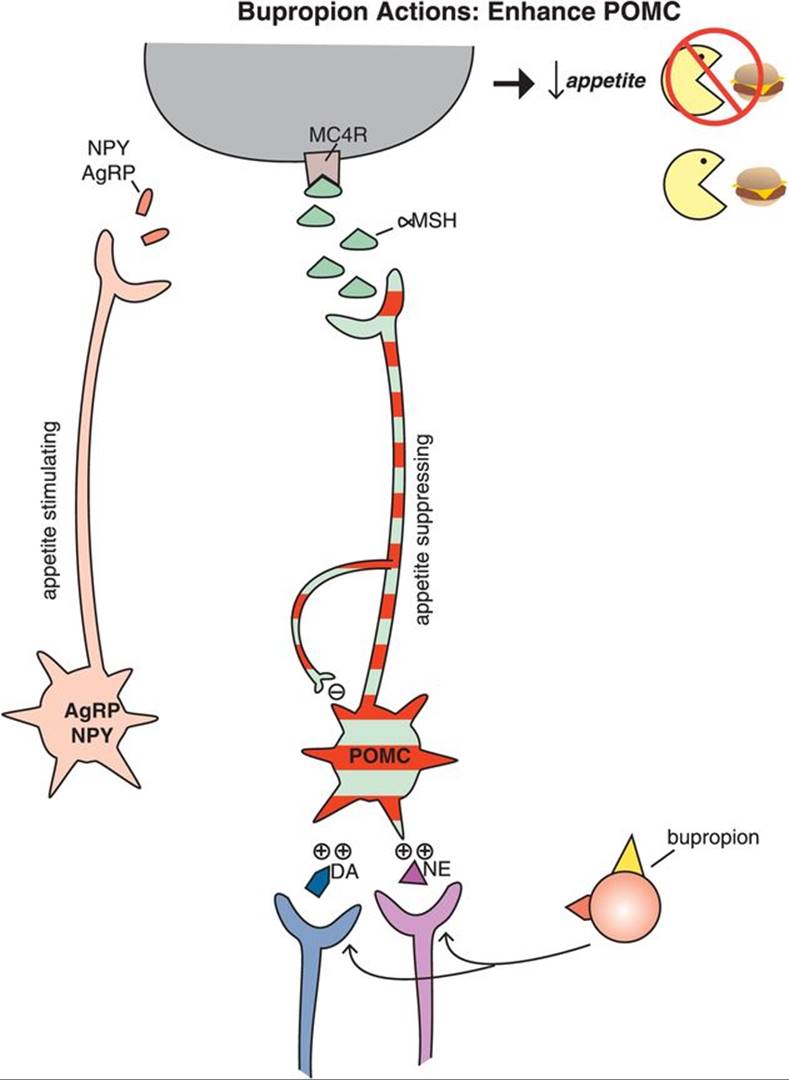 D. Actions of bupropion. The antidepressant and smoking cessation aid bupropion is thought to have effects in the appetite center of the hypothalamus as well. Bupropion increases dopamine (DA) and norepinephrine (NE) in the hypothalamus by blocking both the norepinephrine and dopamine reuptake transporters (NET and DAT, respectively), just as shown in Figure 14-20B, but perhaps less robustly. The increased input of DA and NE onto pro-opiomelanocortin (POMC) neurons in the appetite-suppressing pathway partially activates the POMC neurons (shown as a hatched color on the right) causing an increase in α-melanocyte-stimulating hormone (α-MSH) release, which binds to melanocortin 4 receptors (MC4R) to suppress appetite partially (compare with Figure 14-20B). The actions of bupropion on the appetite-suppressing pathway, however, are mitigated because stimulation of POMC neurons also activates an endorphin/endogenous-opioid-mediated negative feedback loop (also with phentermine and shown in Figure 14-20B).