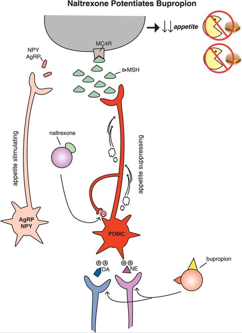 E. Naltrexone potentiates the actions of bupropion. Both naltrexone and bupropion alone can lead to some weight loss by themselves. However, the combination of naltrexone and bupropion has a synergistic effect on weight loss that surpasses monotherapy with either agent by dual pharmacologic actions on the appetite-suppressing pathway. That is, naltrexone blocks the endorphin/endogenous-opioid-mediated negative feedback loop that normally limits the activation of pro-opiomelanocortin (POMC) neurons in the appetite-suppressing pathway (shown in Figure 14-20D with only a hatched neuron on the right). With this negative feedback removed by administration of naltrexone, bupropion can more readily increase firing of POMC neurons (shown here as a red-hot neuron on the right), leading to highly elevated levels of α-melanocyte-stimulating hormone (α-MSH), which binds more robustly to melanocortin 4 receptors (MC4R) to more potently suppress appetite and cause weight loss.