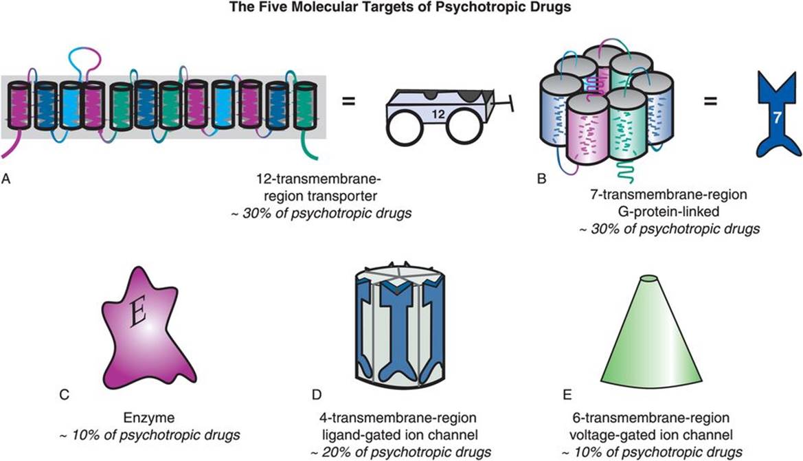 Figure 2-1. The molecular targets of psychotropic drugs. There are only a few major sites of action for the wide expanse of psychotropic drugs utilized in clinical practice. Approximately one-third of psychotropic drugs target one of the twelve-transmembrane-region transporters for a neurotransmitter (A), while another third target seven-transmembrane-region receptors coupled to G proteins (B). The sites of action for the remaining third of psychotropic drugs include enzymes (C), four-transmembrane-region ligand-gated ion channels (D), and six-transmembrane-region voltage-sensitive ion channels (E).