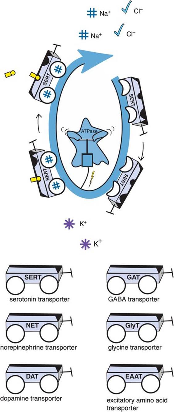In the absence of sodium, there is low affinity of the monoamine transporter for its monoamine substrate, and thus binding of neither sodium nor monoamine. An example of this is shown for the serotonin transporter SERT in Figure 2-2A, where some of the transport “wagons” have flat tires, indicating no binding of sodium as well as absence of binding of serotonin to its substrate binding site, since the transporter has low affinity for serotonin in the absence of sodium. The allosteric site for antidepressant binding is also empty (the front seat in Figure 2-2A). However, in the presence of sodium ions, the tires are “inflated” by sodium binding and serotonin can also bind to its substrate site on SERT. The situation is now primed for serotonin transport back into the serotonergic neuron, along with cotransport of sodium and chloride down the gradient and into the neuron and countertransport of potassium out of the neuron (Figure 2-2A). But if a drug binds to an inhibitory allosteric site on SERT, this reduces the affinity of the serotonin transporter SERT for its substrate serotonin, and serotonin binding is prevented.