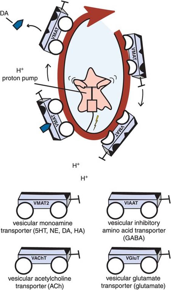 In addition, there are three subclasses of intracellular synaptic vesicle transporters for neurotransmitters. The SLC18 gene family comprises the vesicular monoamine transporters (VMATs) for serotonin, norepinephrine, dopamine, and histamine and the vesicular acetylcholine transporter (VAChT). The SLC32 gene family consists of the vesicular inhibitory amino acid transporters (VIAATs). Finally, the SLC17 gene family consists of the vesicular glutamate transporters, such as VGluT1–3 (Table 2-3 and Figure 2-2B).
