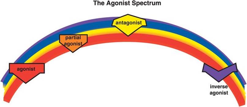 It is possible to produce signal transduction that is something more than an antagonist yet something less than a full agonist. Turning down the gain a bit from full agonist actions, but not all the way to zero, is the property of a partial agonist (Figure 2-7). This action can also be seen as turning up the gain a bit from silent antagonist actions, but not all the way to a full agonist. Depending upon how close this partial agonist is to a full agonist or to a silent antagonist on the agonist spectrum will determine the impact of a partial agonist on downstream signal transduction events.